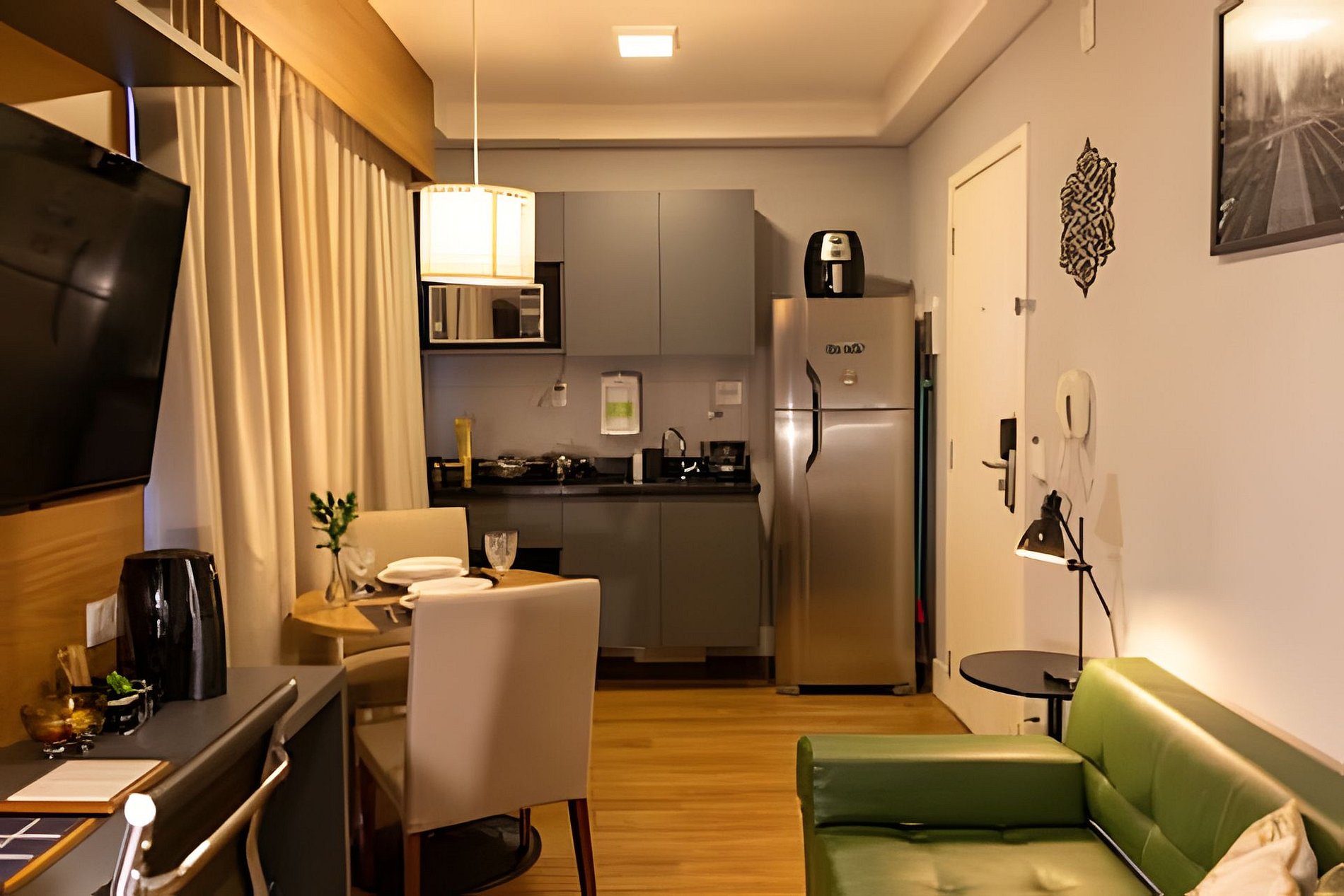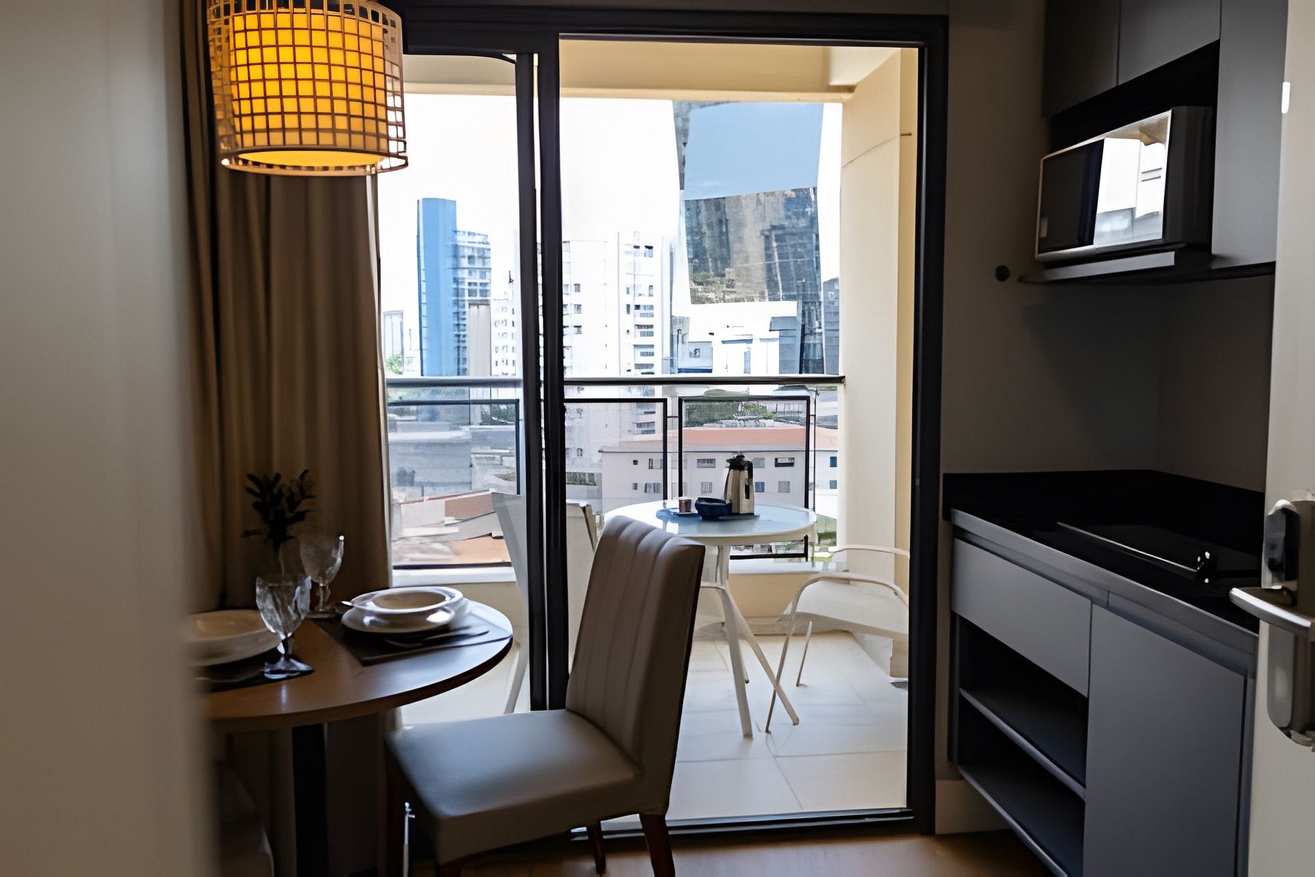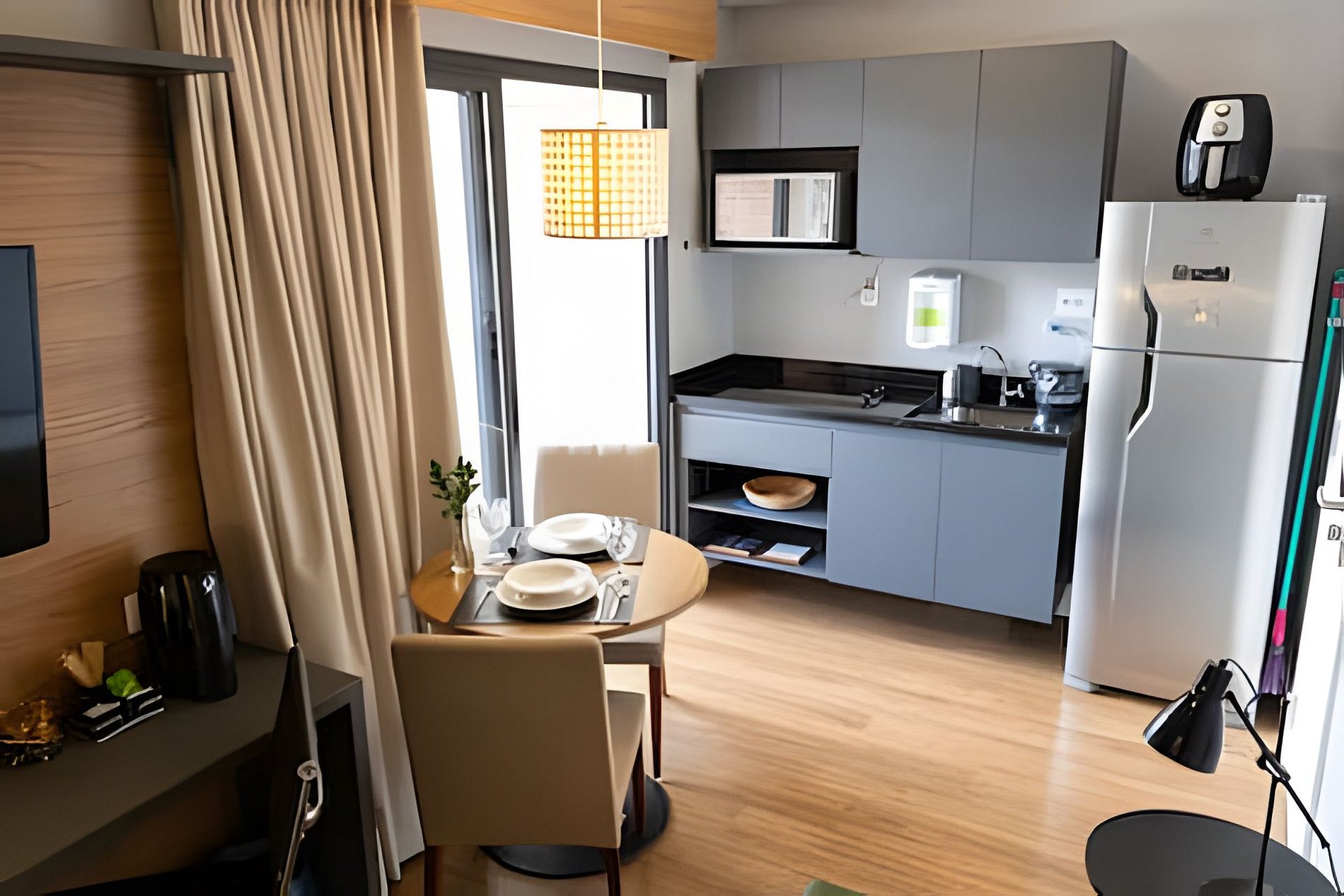A Cozinha está equipada com mesa dois lugares, geladeira, cooktop, microondas, airfryer, talheres, pratos, taças para vinho e espumante, panelas e demais utensílios de cozinha.