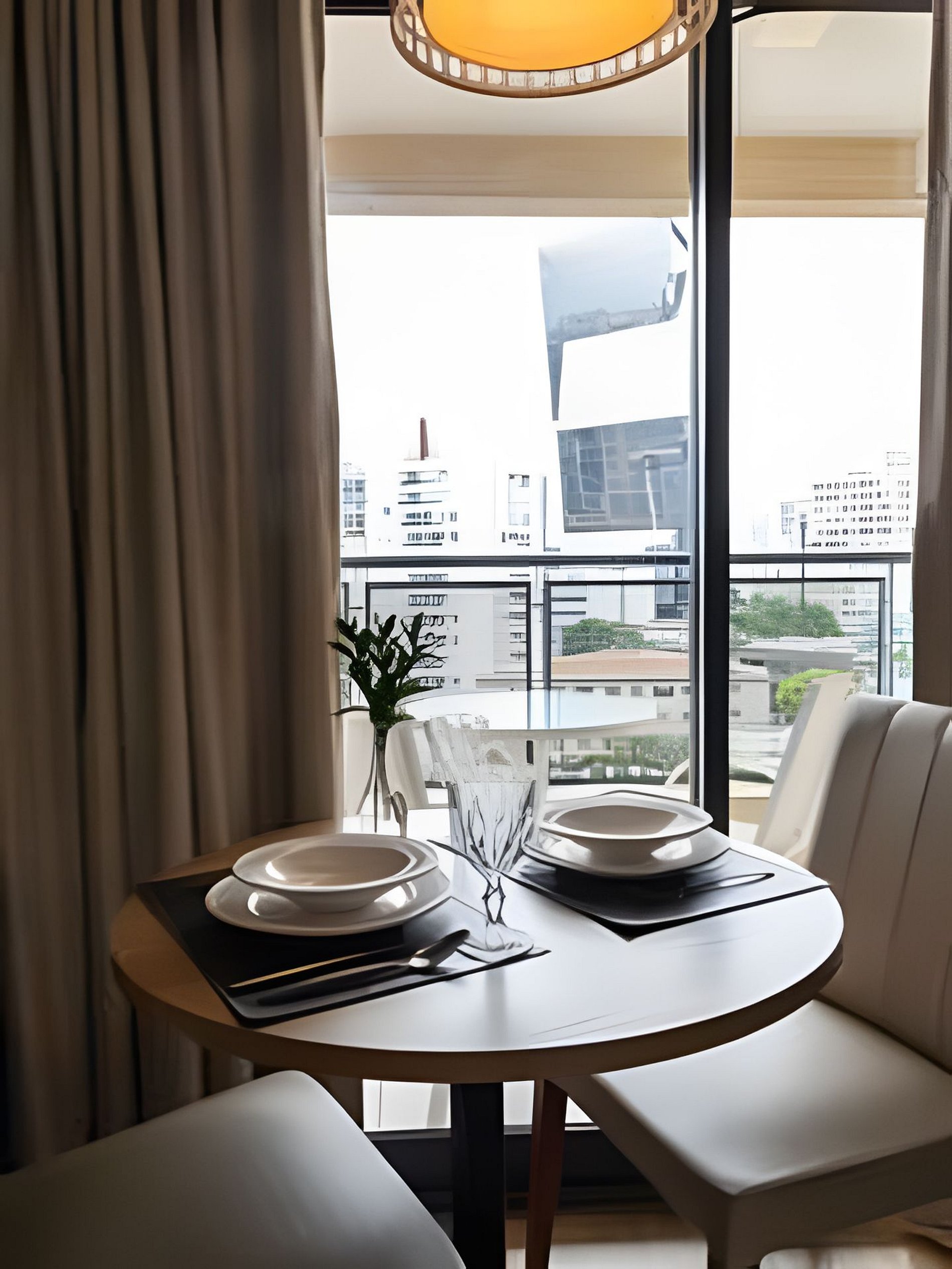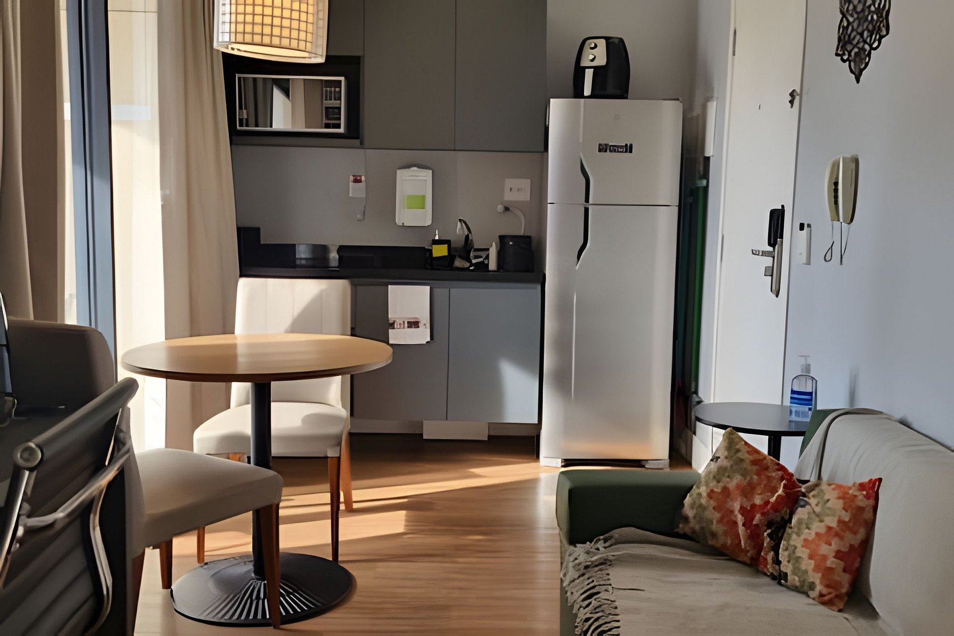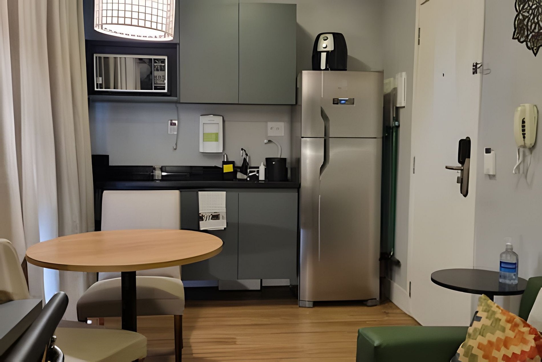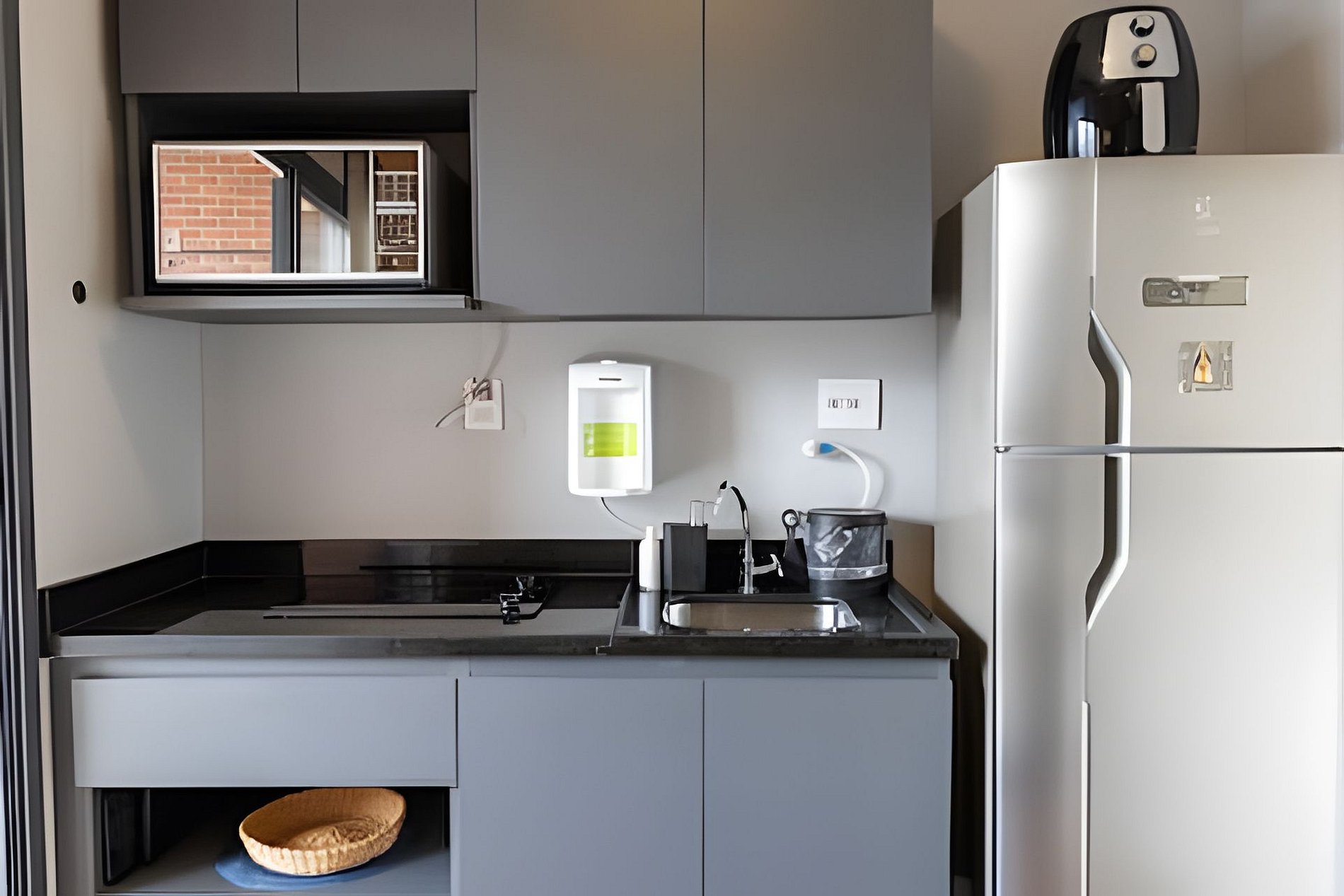 A Cozinha está equipada com mesa dois lugares, geladeira, cooktop, microondas, airfryer, talheres, pratos, taças para vinho e espumante, panelas e demais utensílios de cozinha.