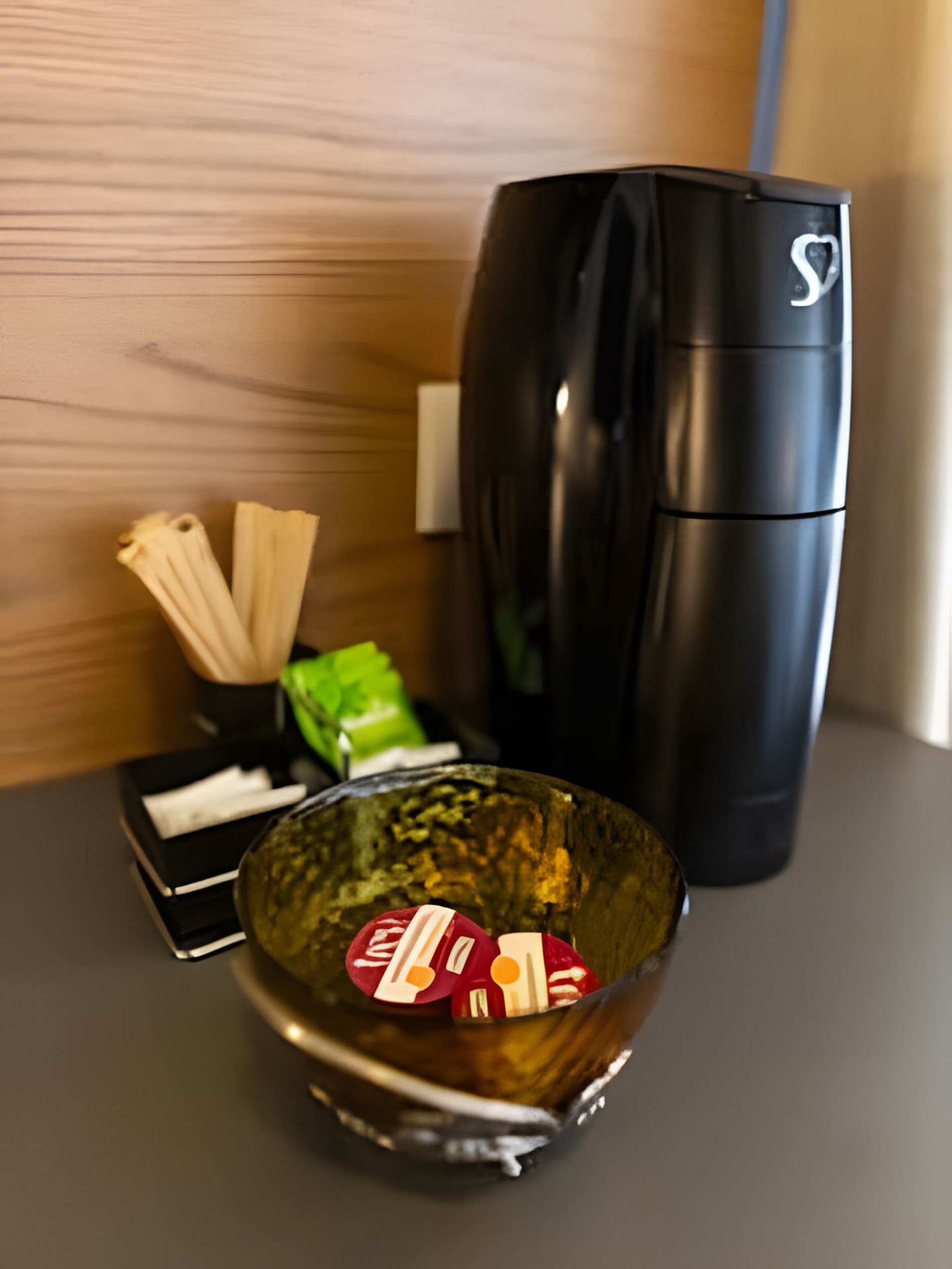 A sala contém ar condicionado, um sofá cama, almofadas, uma TV com canais NET e uma cafeteira.